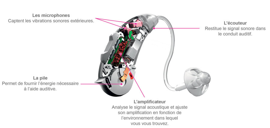 Un appareil auditif est constitué d'un microphone (il capte le son), d'un processeur (il adapte le son à votre type de surdité), d'un écouteur (il diffude le son capté), d'une pile ou une batterie (elle alimente l'appareil auditif).